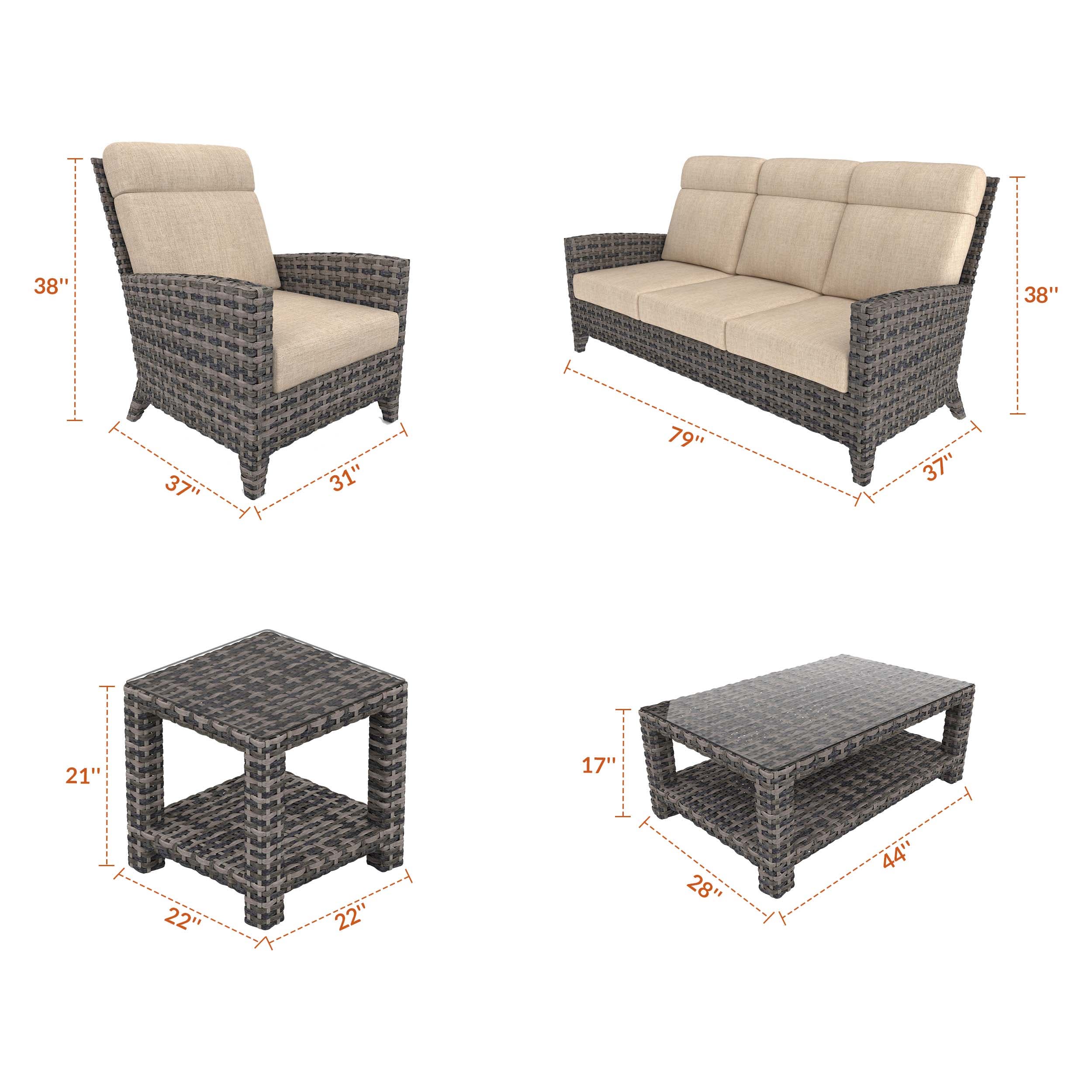 | Dimensions (W x L x H) | Lounge Chair: 31" x 37" x 38" 3 Seater Sofa: 79" x 37" x 38" Coffee Table: 44" x 28" x 17" End Table: 22" x 22" x 21" |