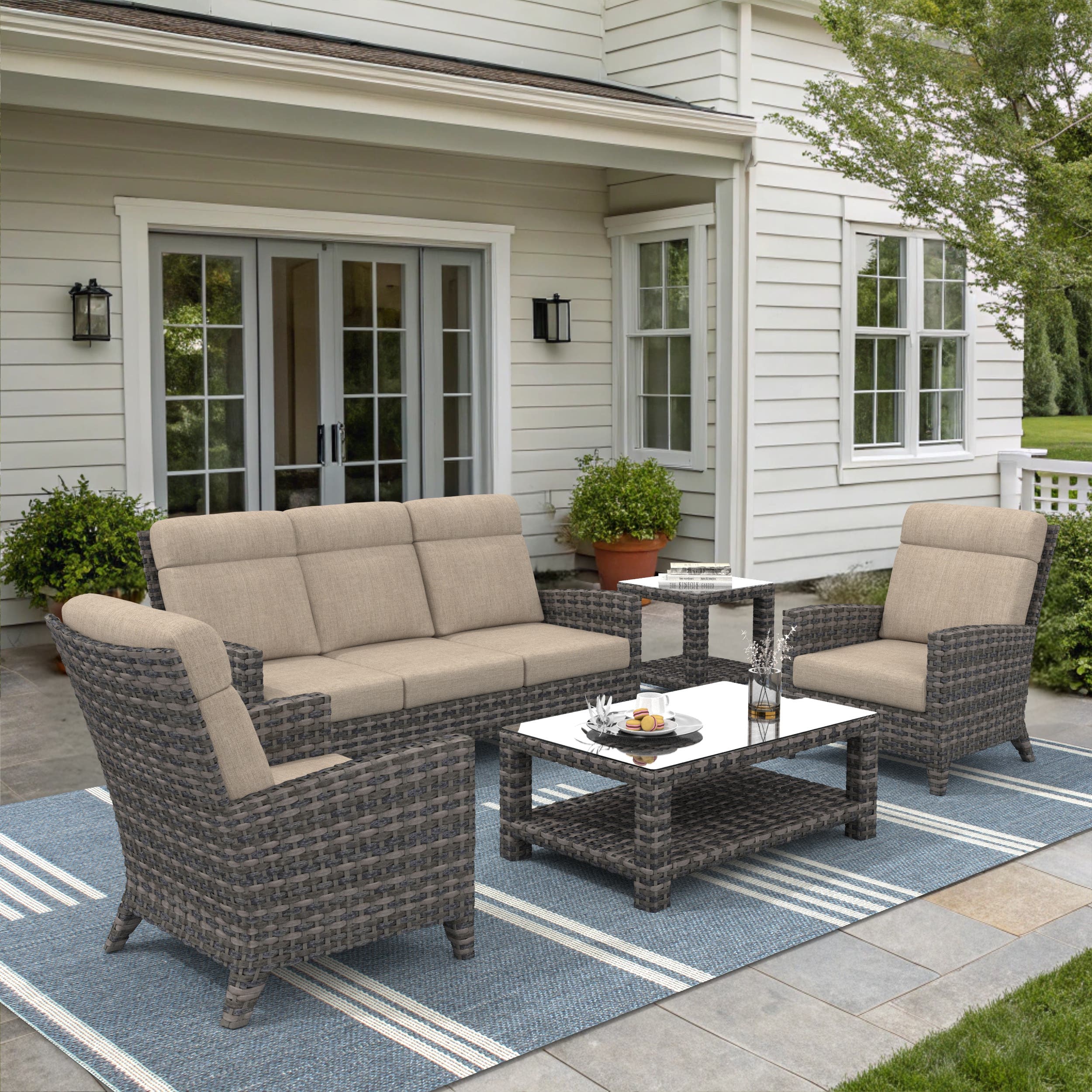 The chairs and sofa feature a high back outdoor chair design that supports the neck and shoulders for extended comfort. Beneath the handwoven buff-toned all-weather wicker, a powder-coated aluminum frame offers lasting durability and rust resistance, ensuring each piece stands up beautifully to the elements. The coffee table anchors the arrangement with practical elegance, balancing function and style.