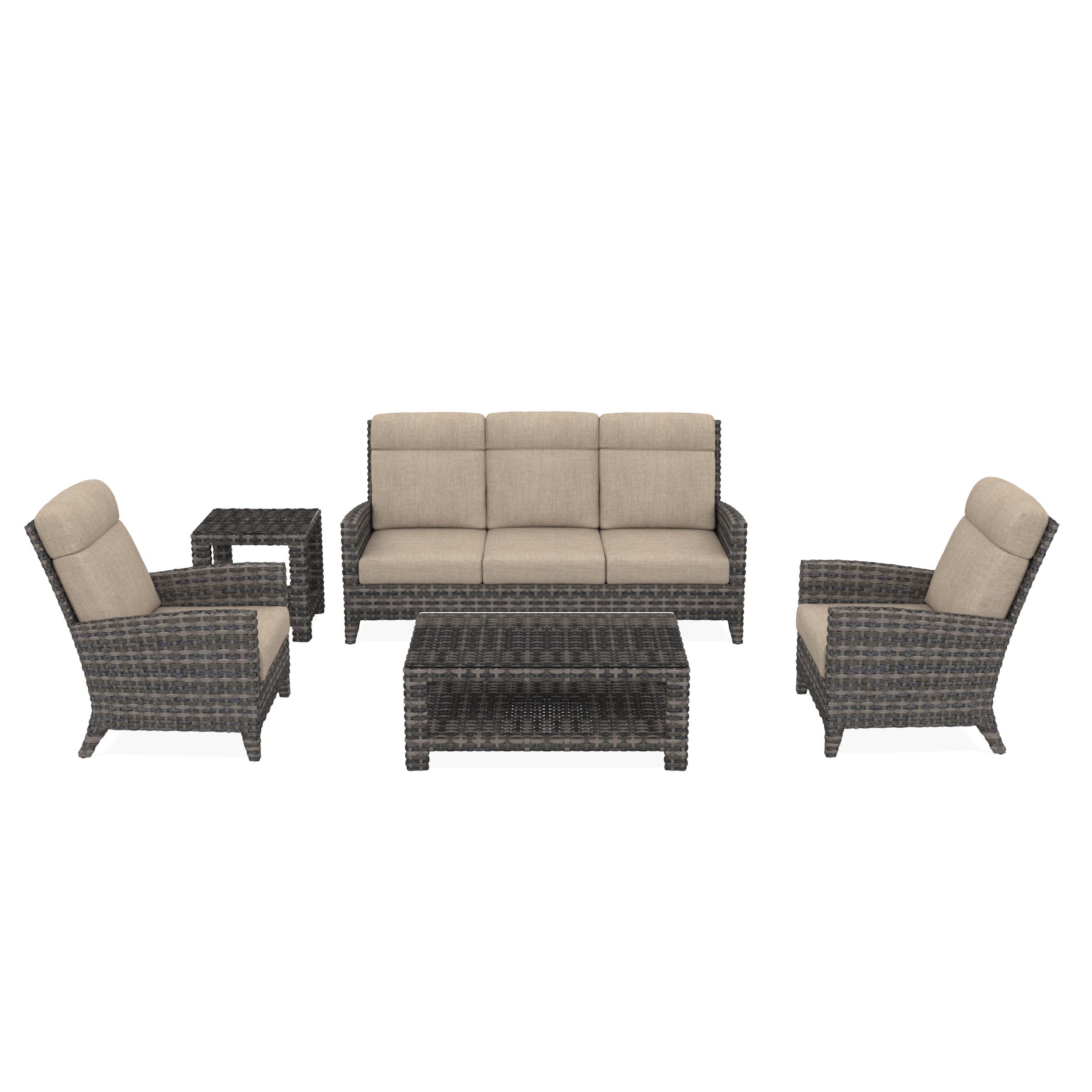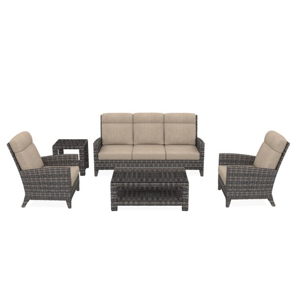 Gather in comfort with this thoughtfully arranged Cavalier 5 seater outdoor set, featuring two lounge chairs, a spacious 3-seater outdoor sofa, a coffee table and a matching end table. Designed for both relaxed weekends and lively conversations, this patio furniture set creates an inviting atmosphere in any outdoor space.