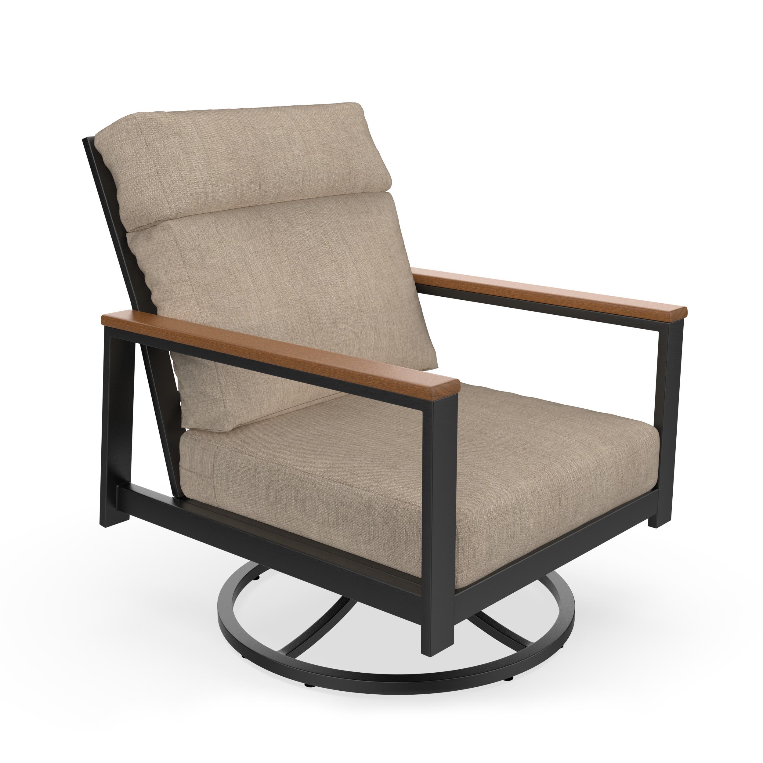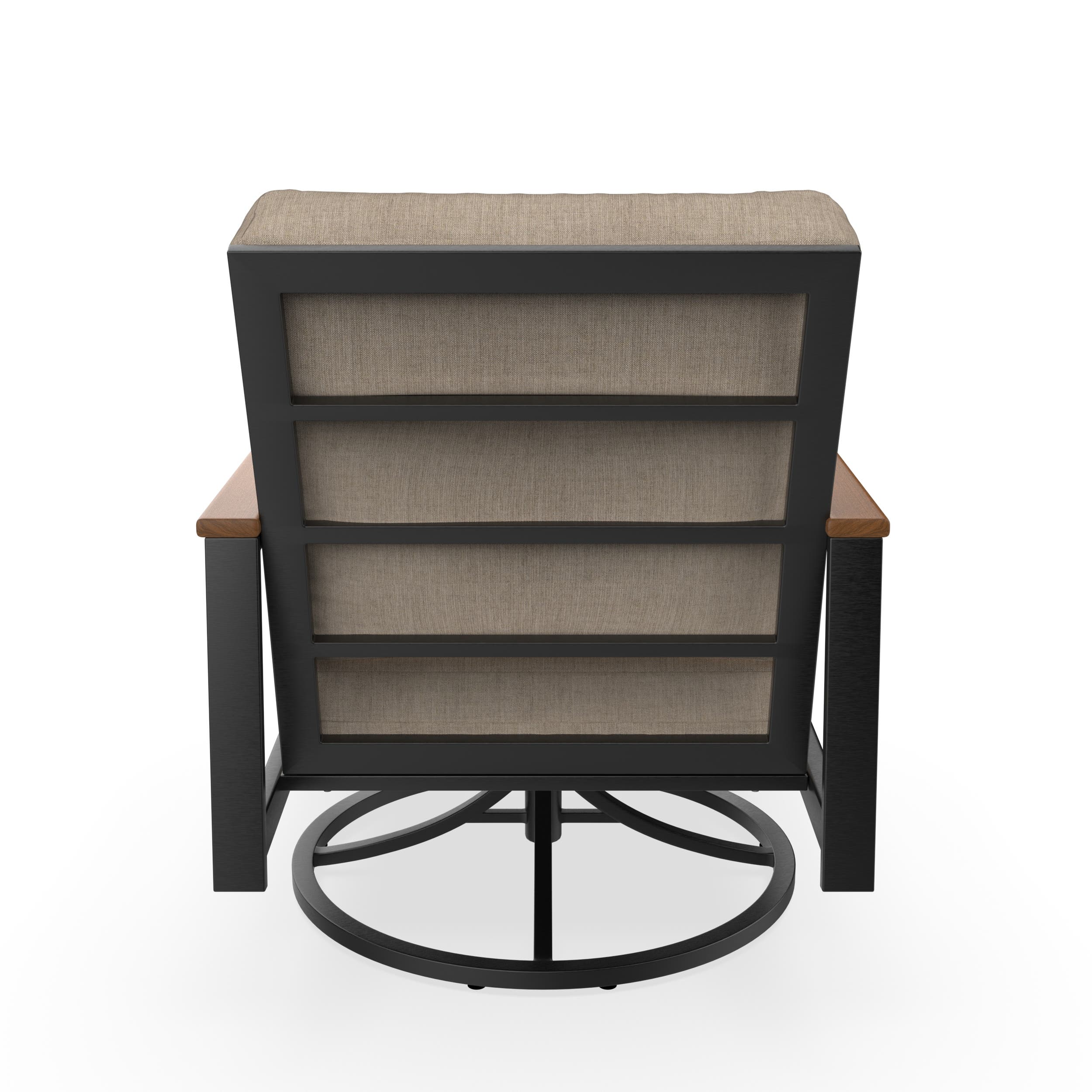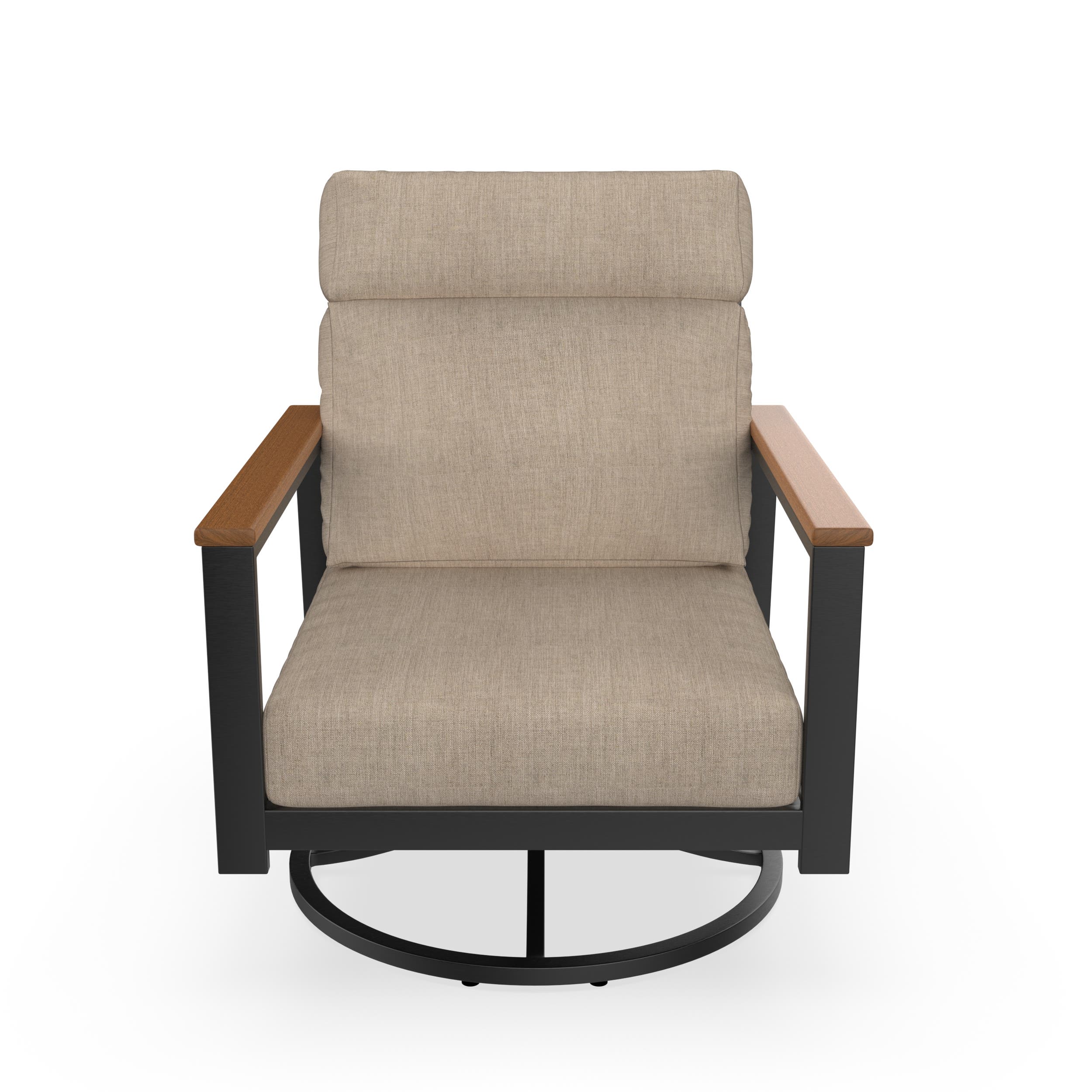 The Windsor Patio Swivel Rocking Chair brings together structured comfort and smooth motion. Designed with a durable black aluminum frame, this high-back chair offers generous support for the neck and shoulders, making it a preferred choice for taller users or those seeking long-lasting comfort outdoors.